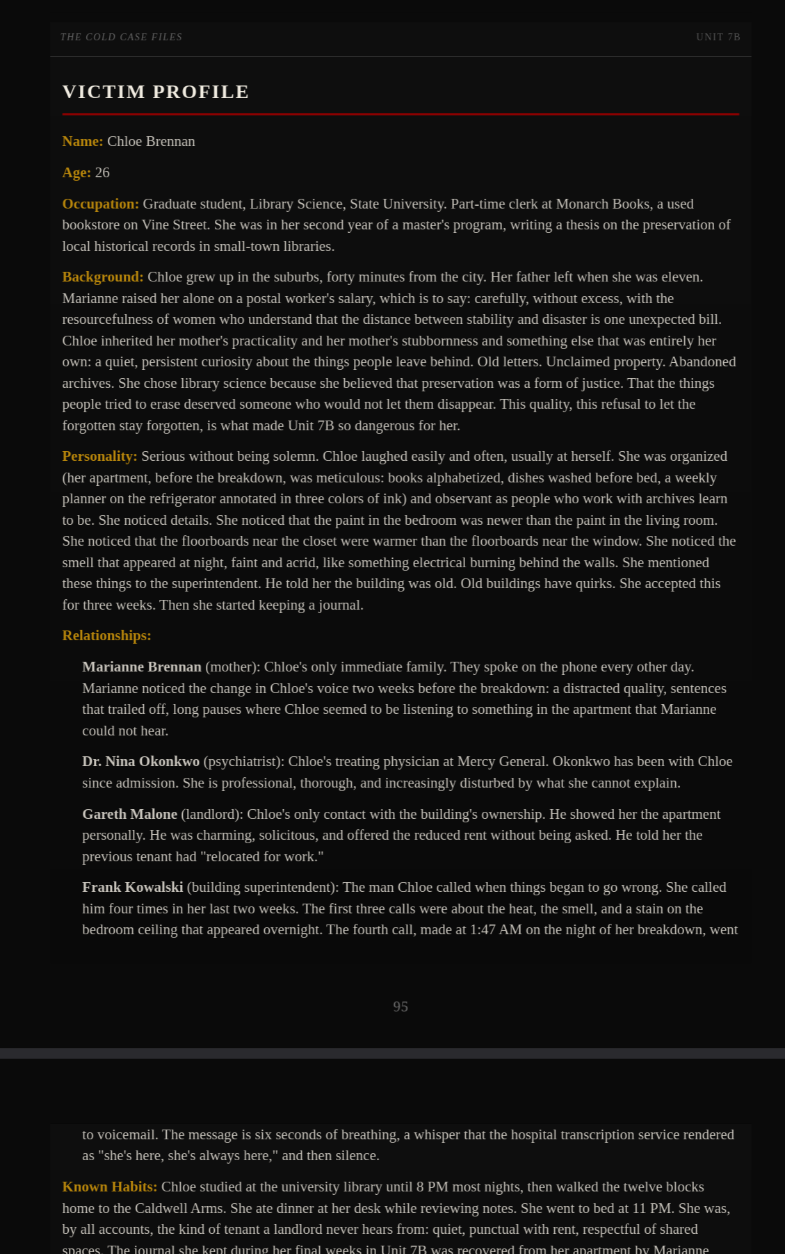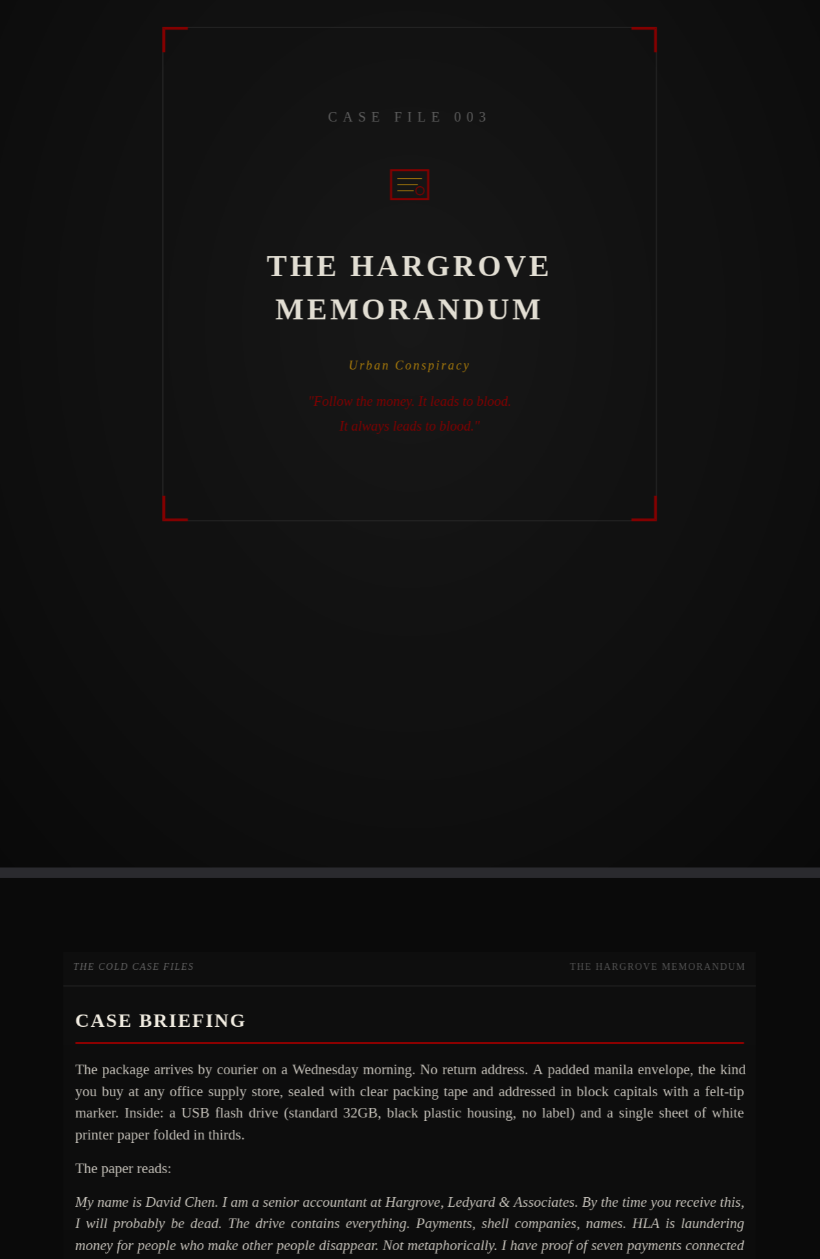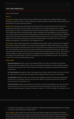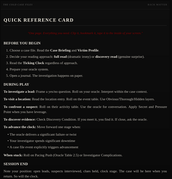 Each case file provides the architecture of a mystery: victims, suspects, locations, evidence, and the conspiracy hiding beneath. You provide the investigation. These frameworks are designed for solo-play, GM-less tables, or as ready-made scenarios for game masters who want investigations with depth and structure.